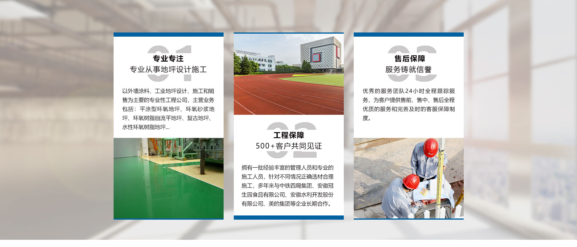 安徽世博裝飾工程有限公司成立于2009年,是一家以外墻涂料、工業(yè)地坪設(shè)計(jì)、施工和銷售為主要的專業(yè)性工程公司、是工業(yè)地坪施工的專業(yè)企業(yè)。公司設(shè)立了售后服務(wù)中心,用戶遍布全國(guó)大中小城市,一大批具有標(biāo)志性的長(zhǎng)期合作伙伴。“世博公司”環(huán)氧地坪工程,受到了越來(lái)越多的不同行業(yè)用戶的好評(píng)及青睞。公司擁有一批經(jīng)驗(yàn)豐富的管理人員和專業(yè)的施工人員,以保障產(chǎn)品的成功應(yīng)用,用較小的代價(jià)獲得理想的效果,尤其在地坪涂裝方面優(yōu)勢(shì)突出。而且以好的品質(zhì)管理模式,向客戶提供“獨(dú)具魅力”、“性能優(yōu)異”、“質(zhì)量穩(wěn)定”的產(chǎn)品。公司主要產(chǎn)品包括:平涂型環(huán)氧地坪、環(huán)氧砂漿地坪、環(huán)氧樹(shù)脂自流平地坪、滾涂型防靜電地坪、自流平防靜電地坪、復(fù)古地坪、水性環(huán)氧樹(shù)脂地坪、彩色透水混凝土地坪、壓花壓模藝術(shù)地坪、金剛砂耐磨硬化地坪、混凝土密封固化劑地坪、乙烯基酯重防腐地坪、GEP 標(biāo)準(zhǔn)型地坪、彈性PU運(yùn)動(dòng)場(chǎng)地坪、塑膠跑道地坪,PVC橡膠地板、停車場(chǎng)地坪、無(wú)震...